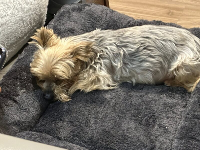現在 Monet 已經回到家裡,舒服地躺在沙發上的黑毛氈。