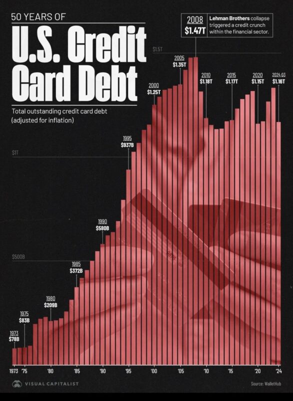 疫情初期信用卡餘額一度下降,但隨著刺激政策結束、通膨上升、儲蓄消耗,餘額急速上升,並在 2024–2025 年突破歷史高位。