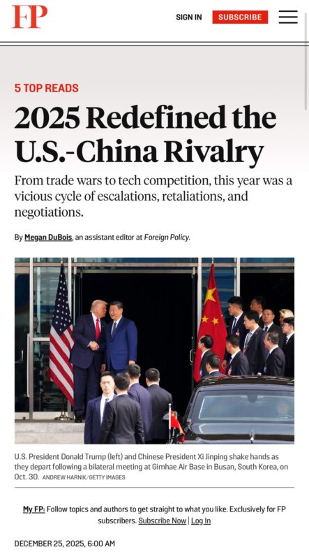 FP:2025 Redefined the U.S.-China Rivalry:From trade wars to tech competition, this year was a vicious cycle of escalations, retaliations, and negotiations.