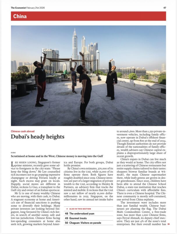 《The Economist》2026年2月21日出版的文章〈Dubai’s heady heights〉描繪了一個正在加速的趨勢:中國資金,正悄悄而持續地流向波斯灣。