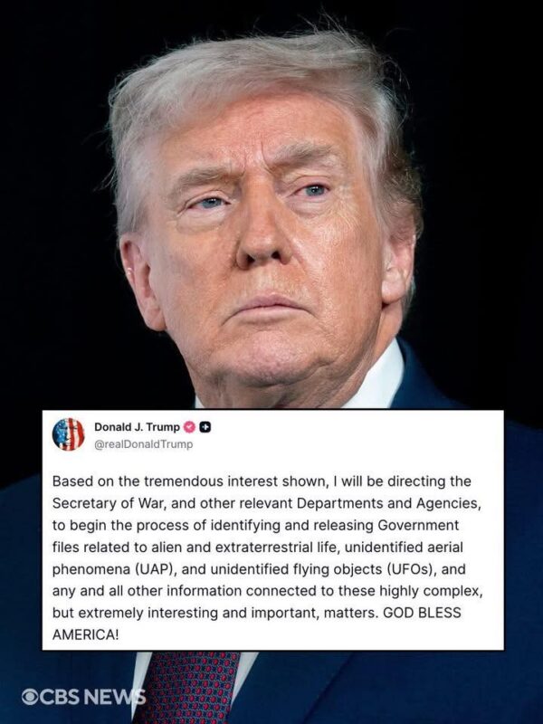 Based on the tremendous interest shown, I will be directing the Secretary of War, and other relevant Departments and Agencies, to begin the process of identifying and releasing Government files related to alien and extraterrestrial life, unidentified aerial phenomena (UAP), and unidentified flying objects (UFOs), and any and all other information connected to these highly complex, but extremely interesting and important, matters. GOD BLESS AMERICA!