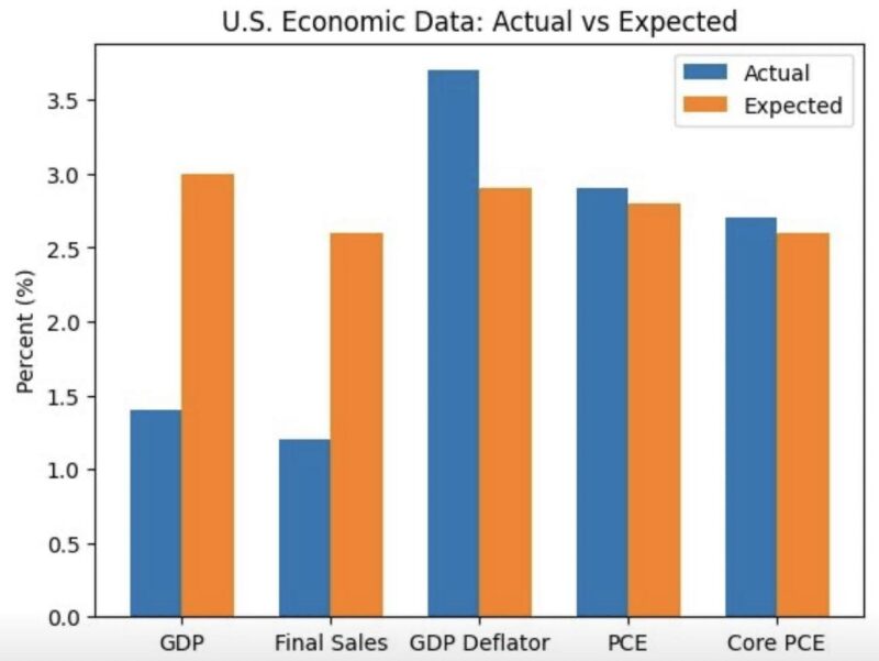 從表面看,美國經濟仍在擴張,但細節開始變得不那麼舒服。GDP僅錄得 +1.4%,明顯低於市場原先預期的 +3.0%。若進一步觀察被視為更乾淨需求指標的最終銷售(Final Sales),情況更顯疲弱——僅 +1.2%,遠低於預測的 +2.6%。