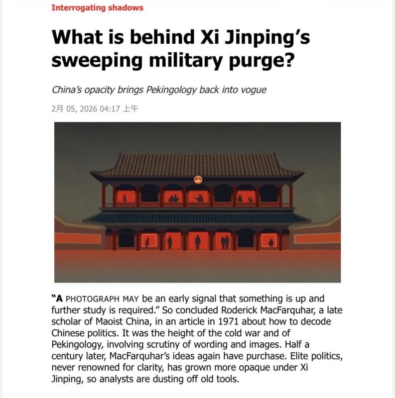 在2026年2月7日出版的《經濟學人》中,有一篇分析中國軍中高層整肅的文章,標題直接發問:習近平的大規模軍中清洗,究竟意味著什麼?