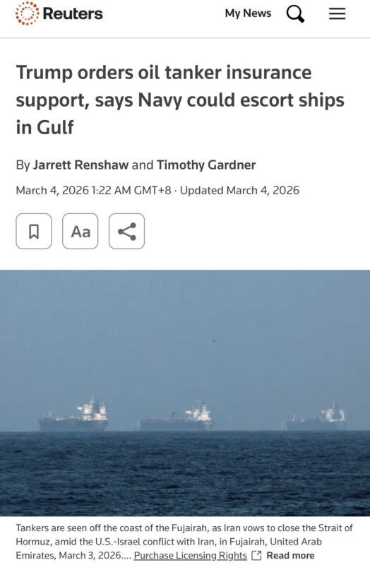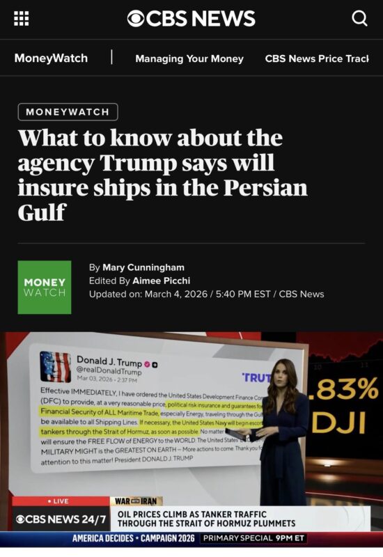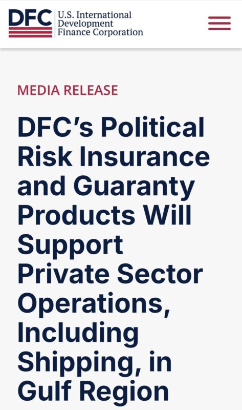 美國政府宣布,由 美國國際開發金融公司(DFC) 為所有經過波斯灣的商業航運提供政治風險保險與政府擔保,必要時由美國海軍護航。