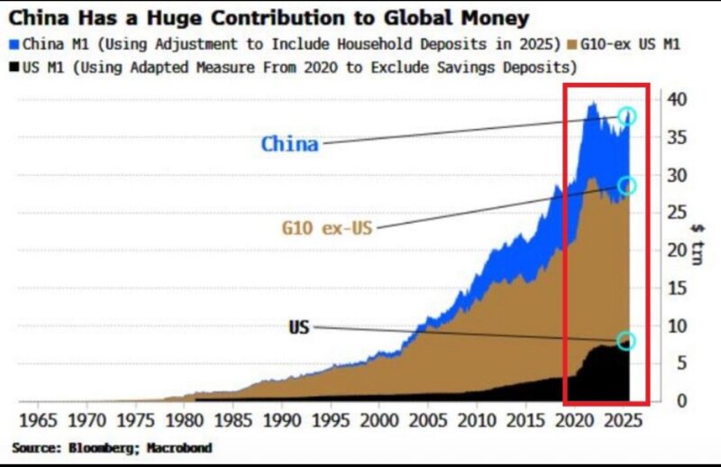 在這張由 Bloomberg 與 Macrobond 整理的圖表中,藍色區塊的「中國 M1(包含現金與可隨時使用的存款)」已經清楚地宣告了一個結構性轉折——全球貨幣增量的主引擎,已不再是美國,而是中國。