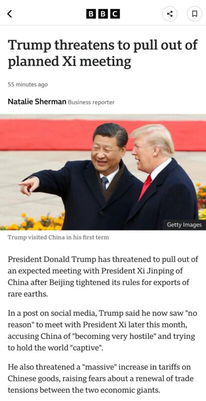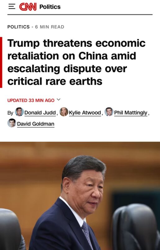 他指責中國對稀土實施出口管制,是「對全球貿易的敵對行為」;他憤然取消原訂的「特習會」,揚言大幅提高關稅——一句話,世界兩大經濟體的關係,正式回到寒冬。