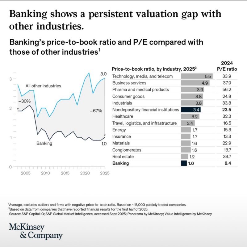 2024 年銀行業的本益比(P/E)僅 8.4 倍,而其他產業多在 20 至 50 倍之間。這並非短期現象,而是自 2008 年金融危機以來,全球資本市場結構性的不信任延續。