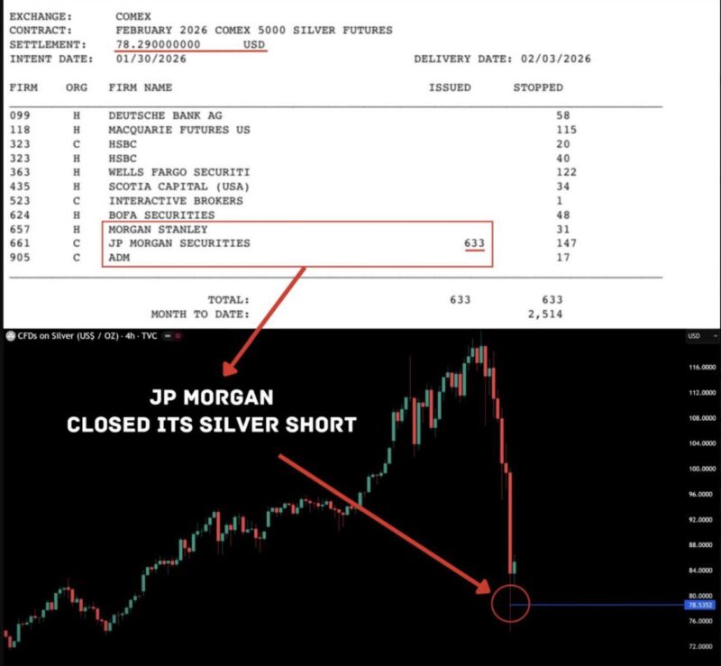 JP Morgan 當日在價格 78.29 美元附近平倉了 317 萬盎司空頭部位,並且在這個價格水平 發出了全部 633 份當日白銀交割通知。