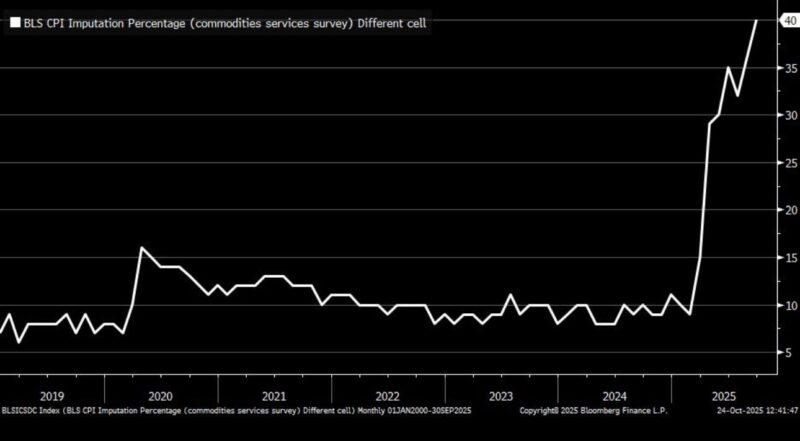 根據美國勞工統計局(BLS)的資料,用於編制消費者物價指數(CPI)的「估算百分比」(imputation percentage)——即以統計模型推算、而非實際觀察所得價格的比例——已經飆升至近 40%,創下有記錄以來的最高水平。(見附圖)