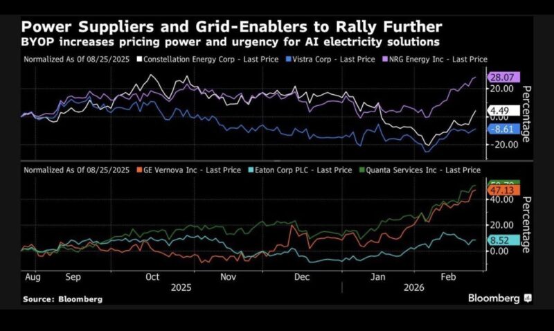 以 Constellation Energy、Vistra Corp.、NRG Energy、GE Vernova、Eaton Corporation 及 Quanta Services 為代表的一籃子電力與電網相關公司,在觀察期間內普遍跑贏大盤,多檔錄得雙位數升幅。