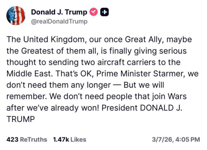 今次伊朗戰爭,也影響了美國和很多盟友之間的關係,計西班牙不願意借出基地,英國也因為反應得太遲,引來特朗普這篇貼文: