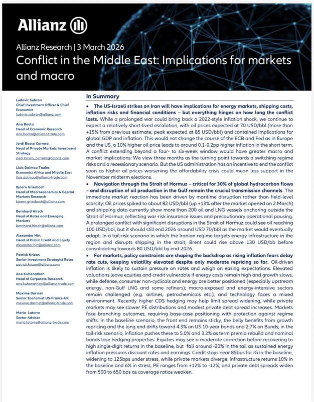 根據 Allianz Research 最新評估,這場衝突對市場的影響高度取決於一件事:衝突會拖多久。
