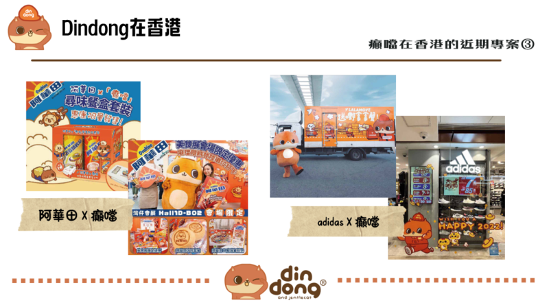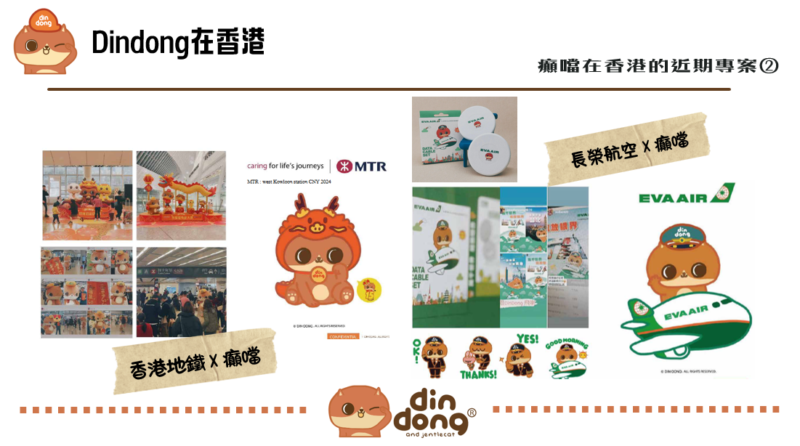 癲噹 x 香港Dindong在香港-IP聯名合作專案 從漫畫走入日常:療癒 IP 與各大知名品牌的合作 癲噹最初以漫畫和插畫形式在香港亮相,以貼近日常生活、輕鬆幽默又帶點哲思的故事風格,迅速引起讀者共鳴。隨著角色人氣不斷提升,癲噹逐步拓展至動畫、出版物、品牌聯名及周邊商品,並成為香港最具代表性的本土原創 IP 之一。 品牌聯名-洪瑞珍三明治 品牌聯名 – THE BLUE 正旅館 藍