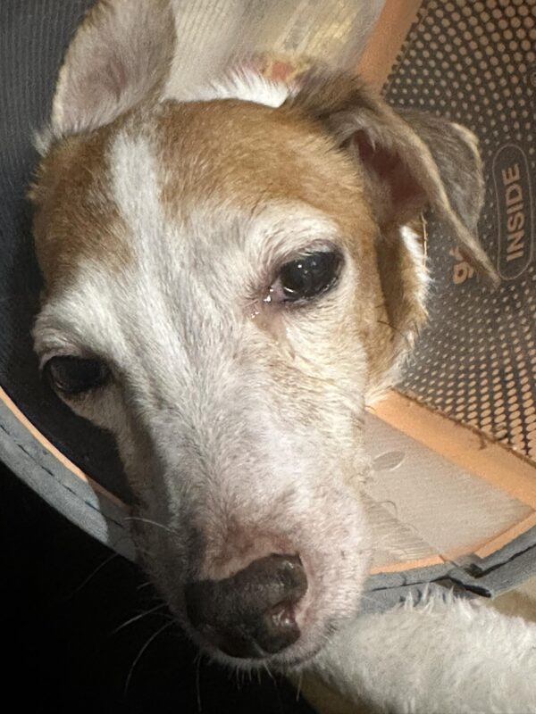 有時她會想用爪子碰碰眼睛,所以只可以二十四小時帶着Elizabethan Collar (狗狗用的頭罩)。