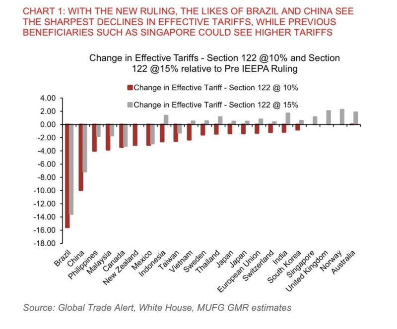 以亞洲為例,新加坡因只拿到10%的基準關稅,若Section 122最終提高至15%,實際有效關稅反而可能上升。